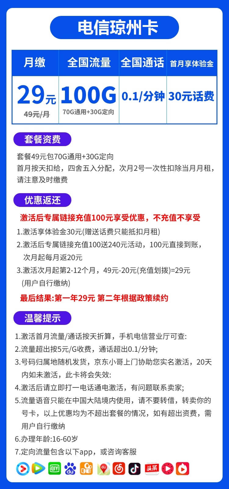 电信琼州卡29元月租+70GB通用+30GB定向+长期续约。
