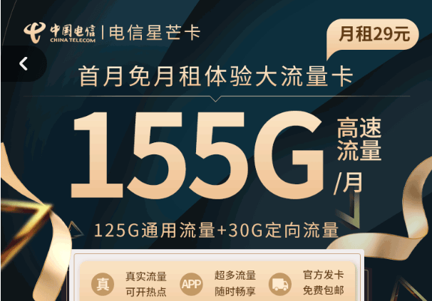 - 套餐内包含了155G高速流量(其中125G通用流量+30G定向流量)。