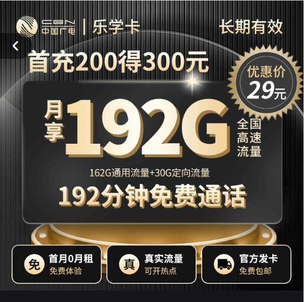 - 该套餐原来月租是29元/月60G流量,优惠后为首月0月租,次月起19元/月。可享受192G超大流量。